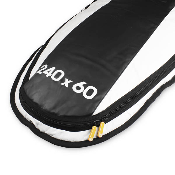 A zip around the top outer edge instead of along the rails provides more room for foot straps and allows most multi-fin boards to be loaded with fins in place.